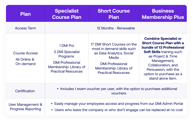 DMI Business Membership Plans are designed for marketing teams with time & budget constraints, and customised training needs for each role and seniority level. Tailored to accommodate diverse seniority levels and skill sets, our comprehensive suite of on-demand courses, content and resources ensures that the needs of each member of your team are met and aligned to their role.